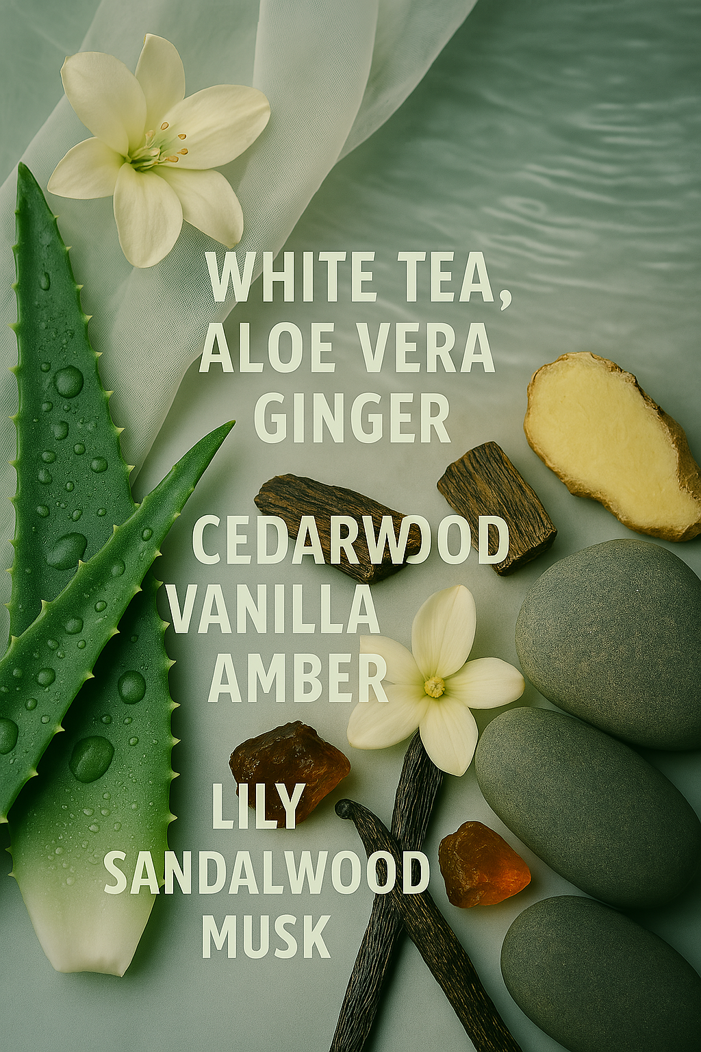 From the moment this luxury home fragrance fills your space, you'll be transported to a world of refined relaxation. The scent journey begins with an invigorating burst of white tea and cooling aloe vera, brightened by a subtle hint of ginger that awakens the senses with spa-like freshness.